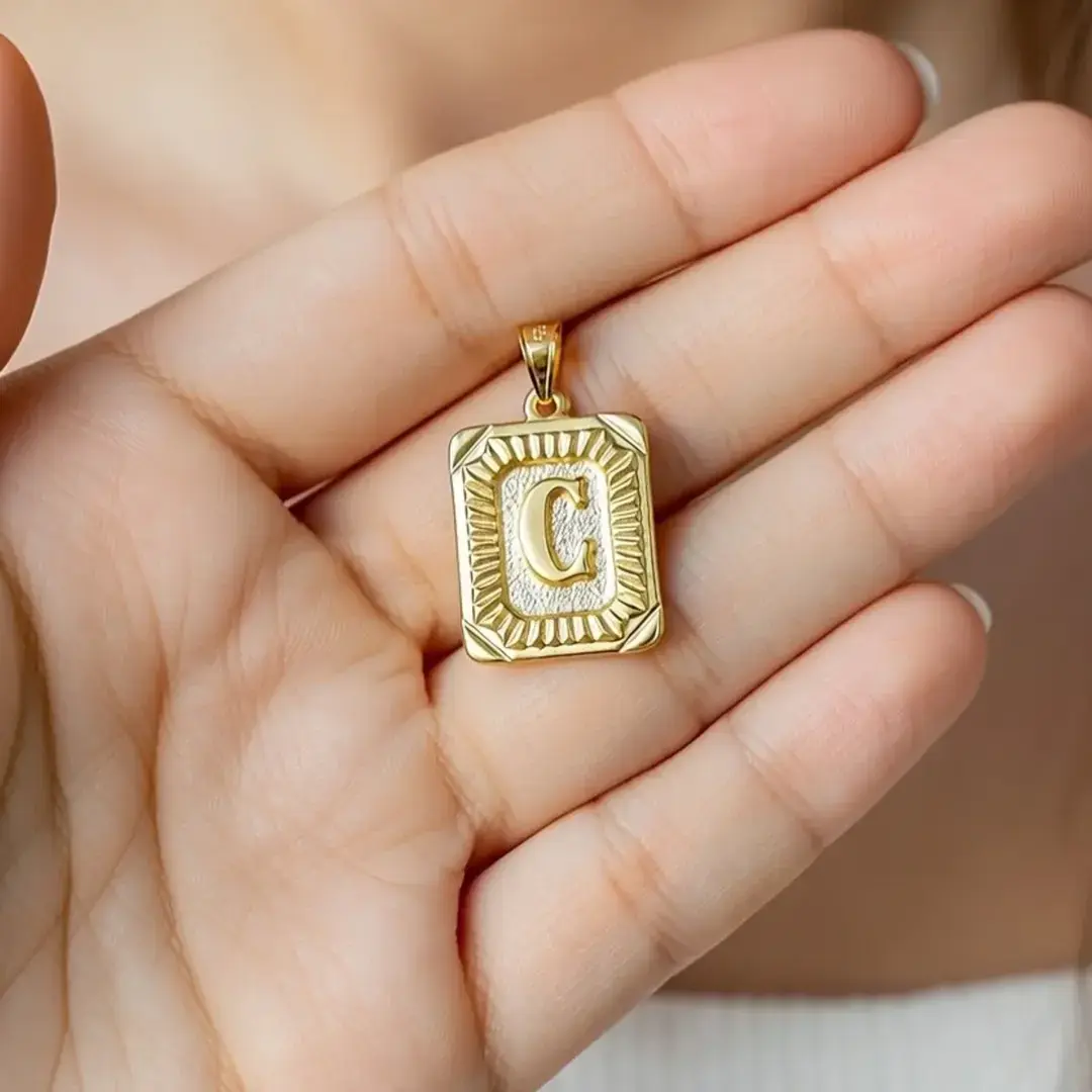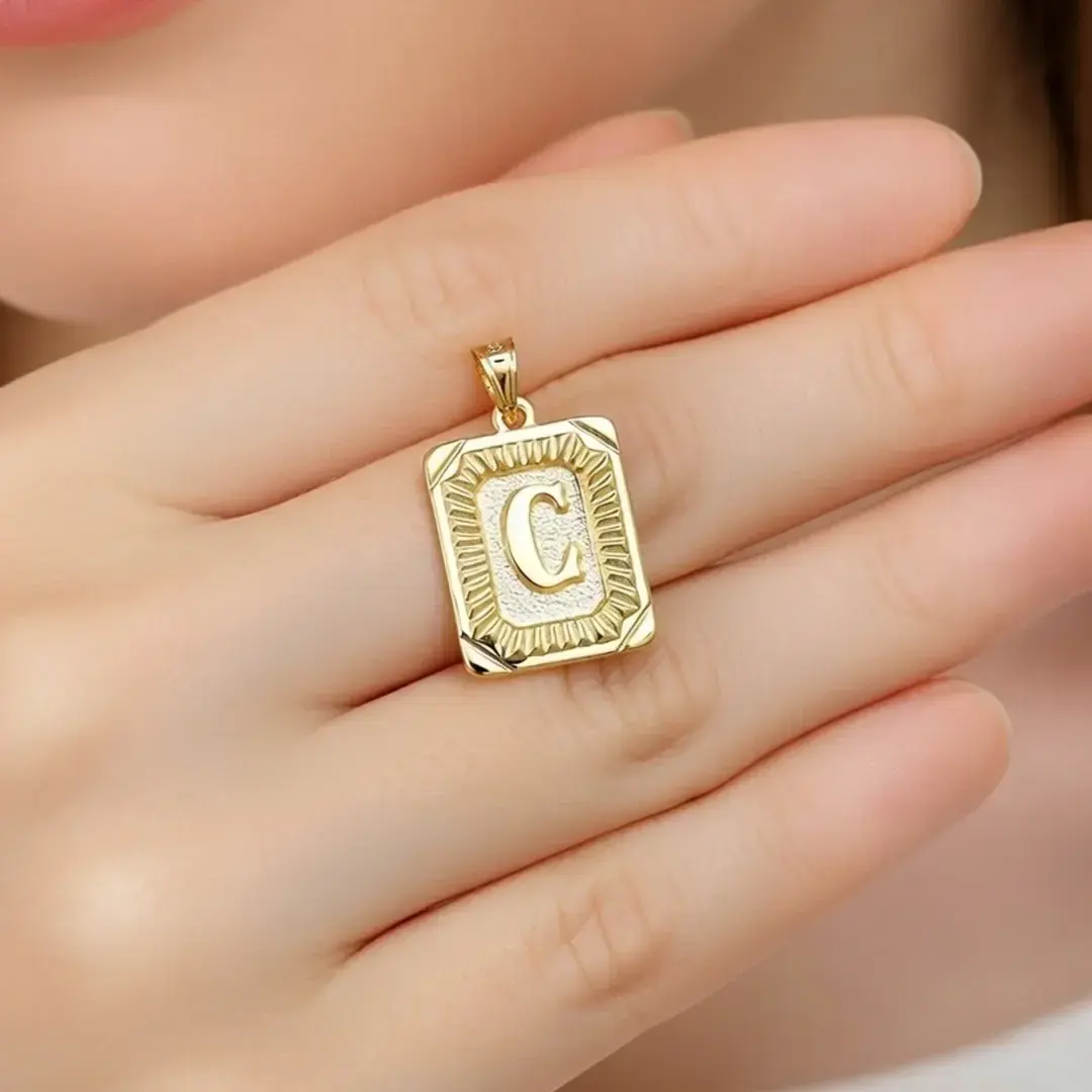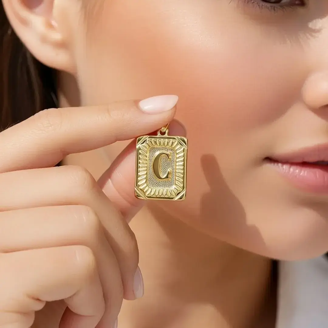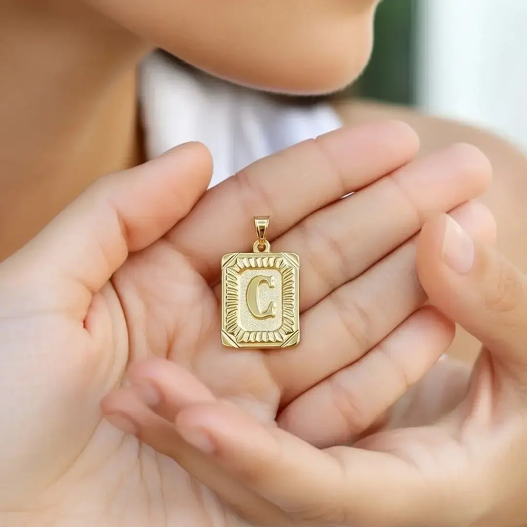 14 Ayar Altın Vintage Dikdötrgen Harf Kolye Ucu ( C Harfi )