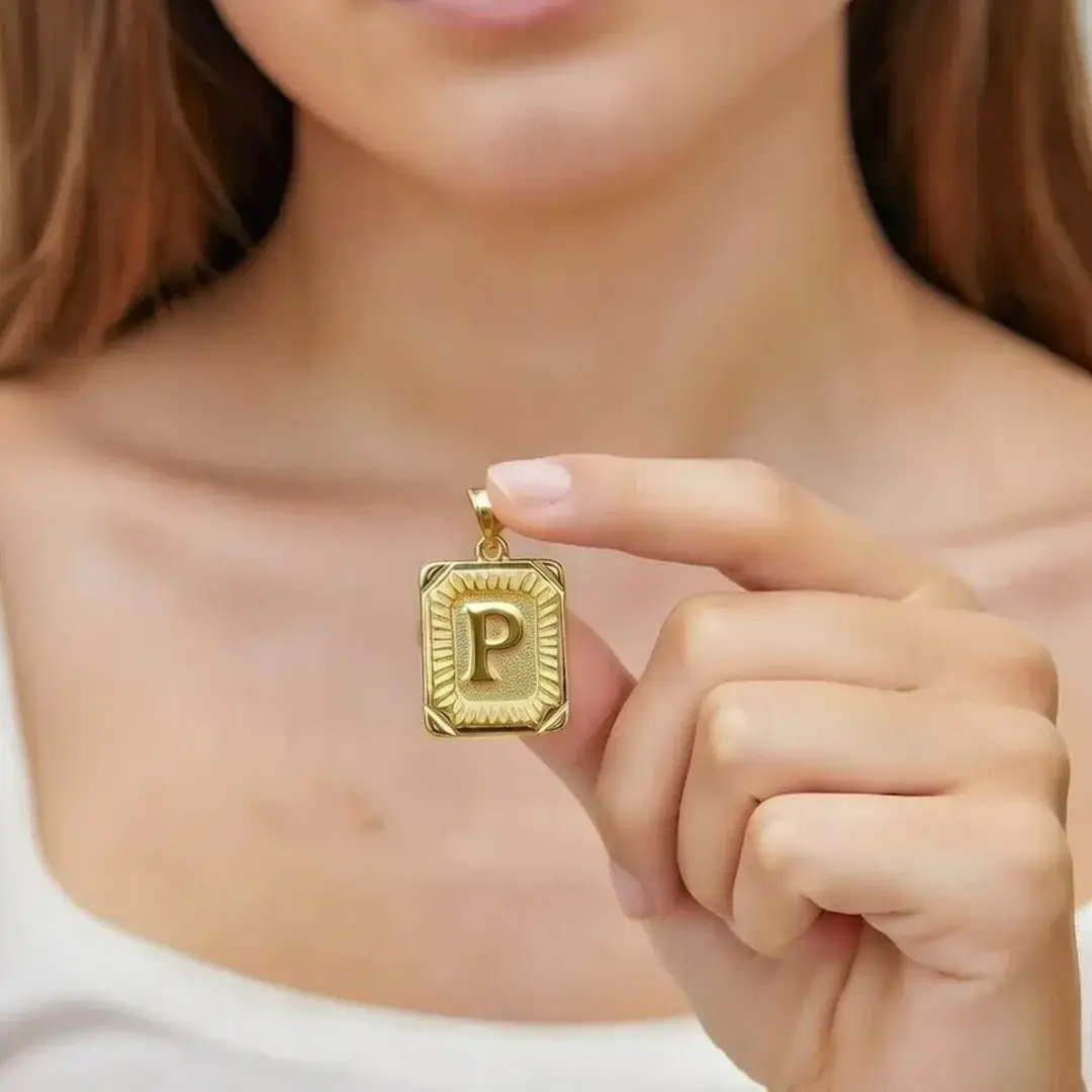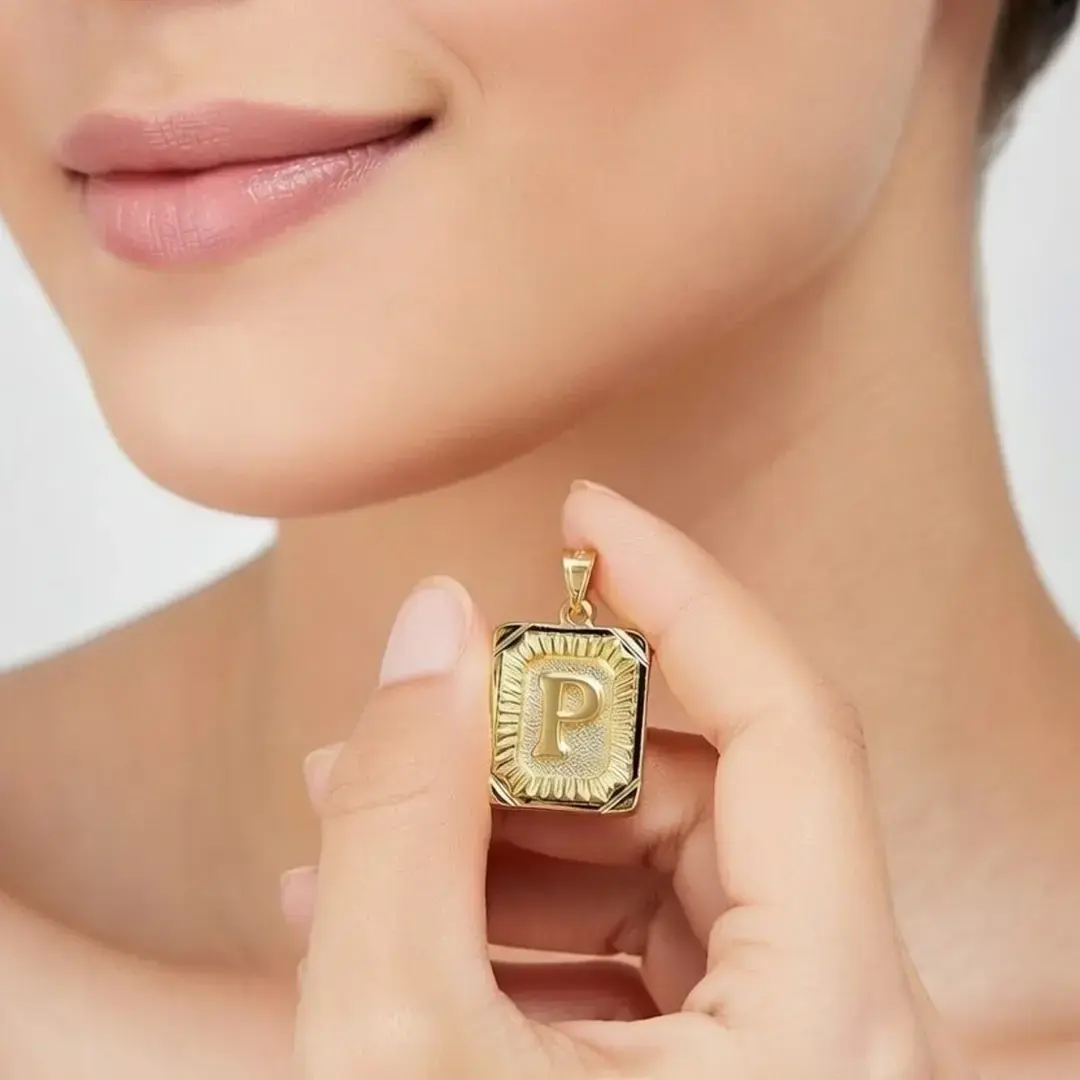 14 Ayar Altın Vintage Dikdötrgen Harf Kolye Ucu ( P Harfi )