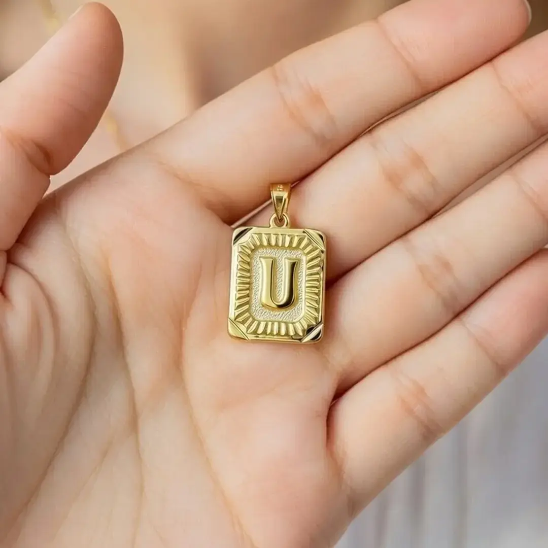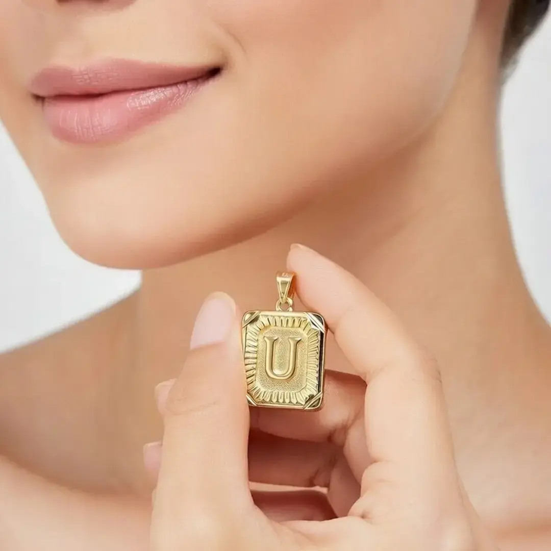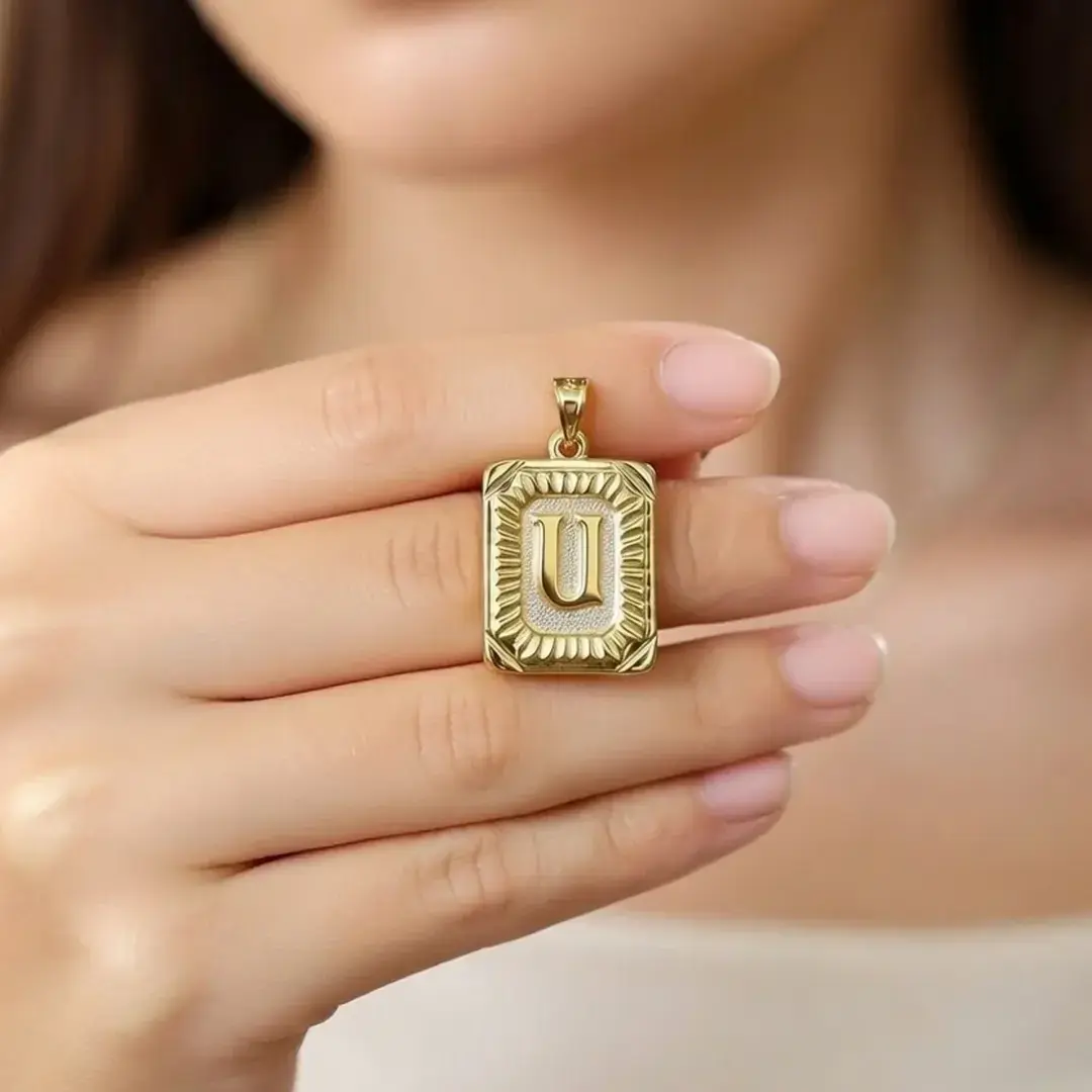 14 Ayar Altın Vintage Dikdötrgen Harf Kolye Ucu ( U Harfi )