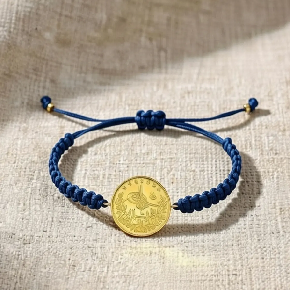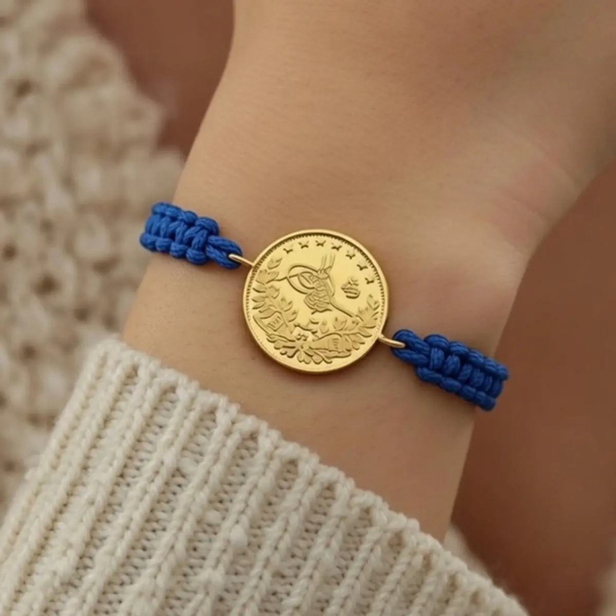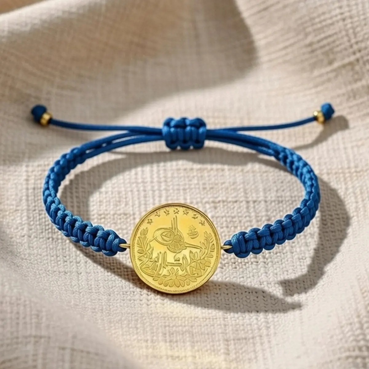 8 Ayar Altın Tuğralı İpli Bileklik (Mavi)