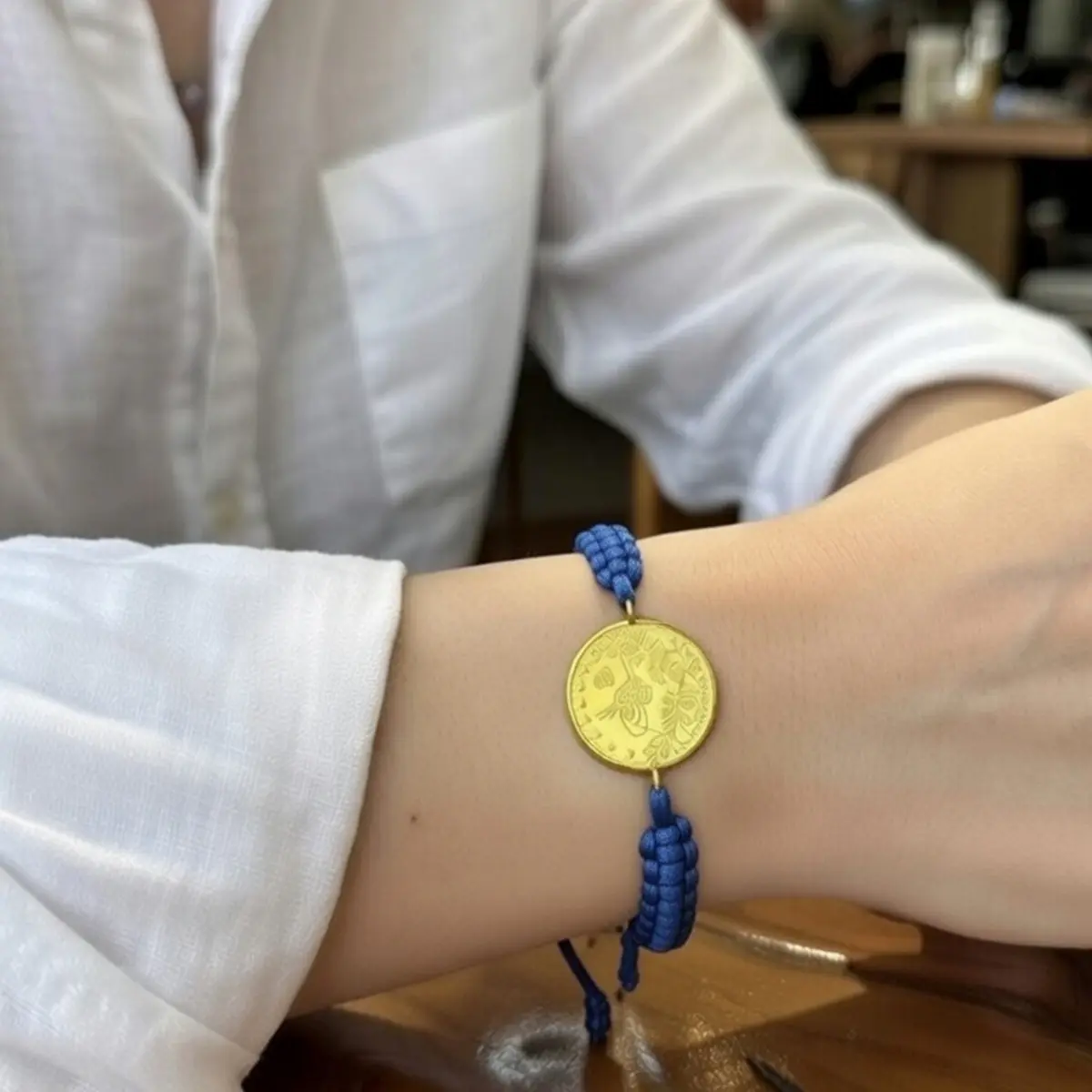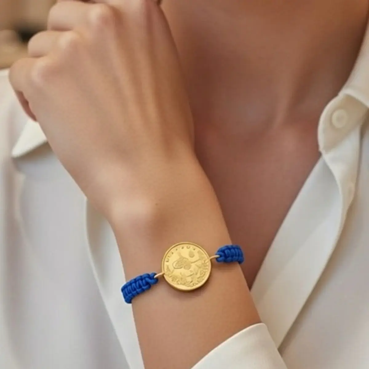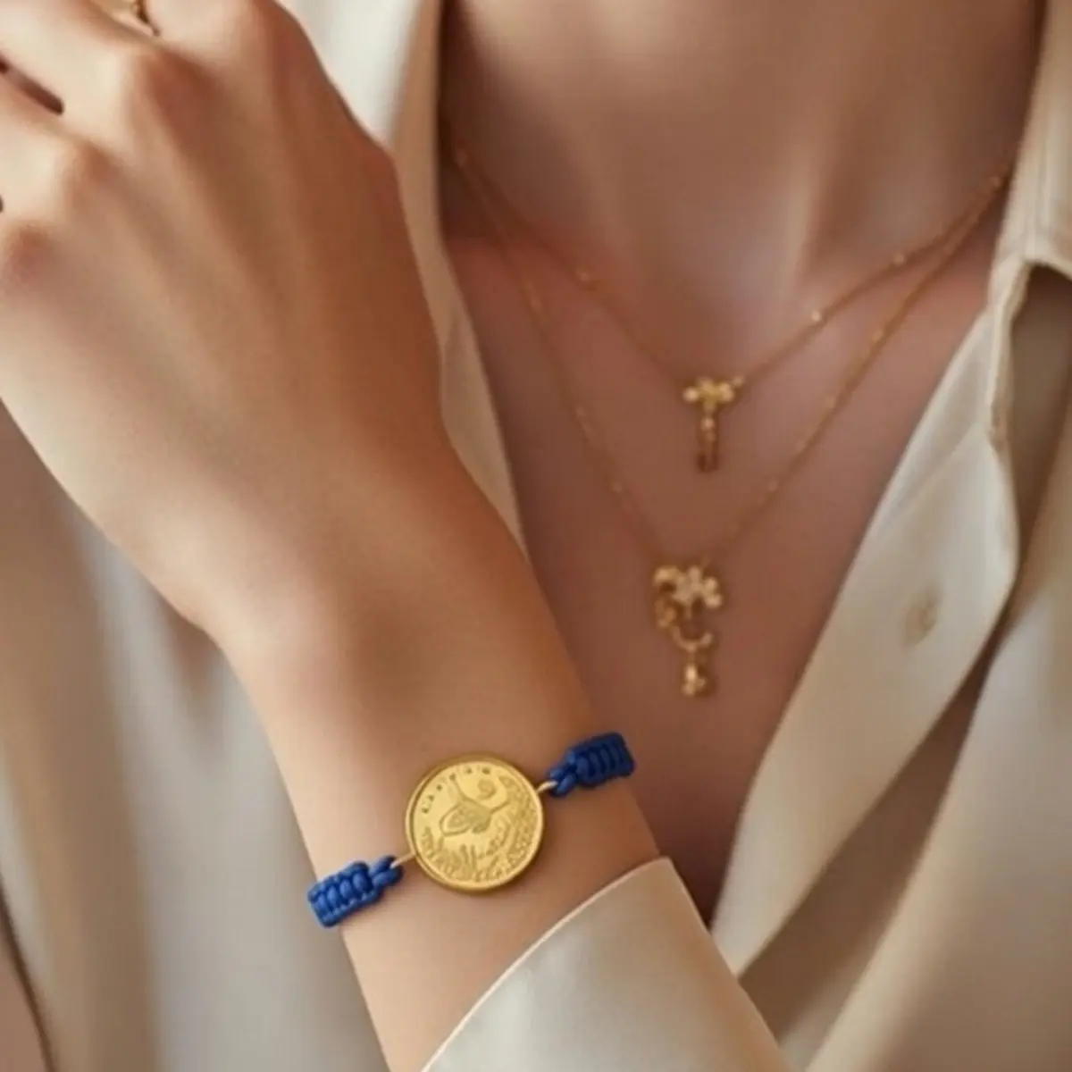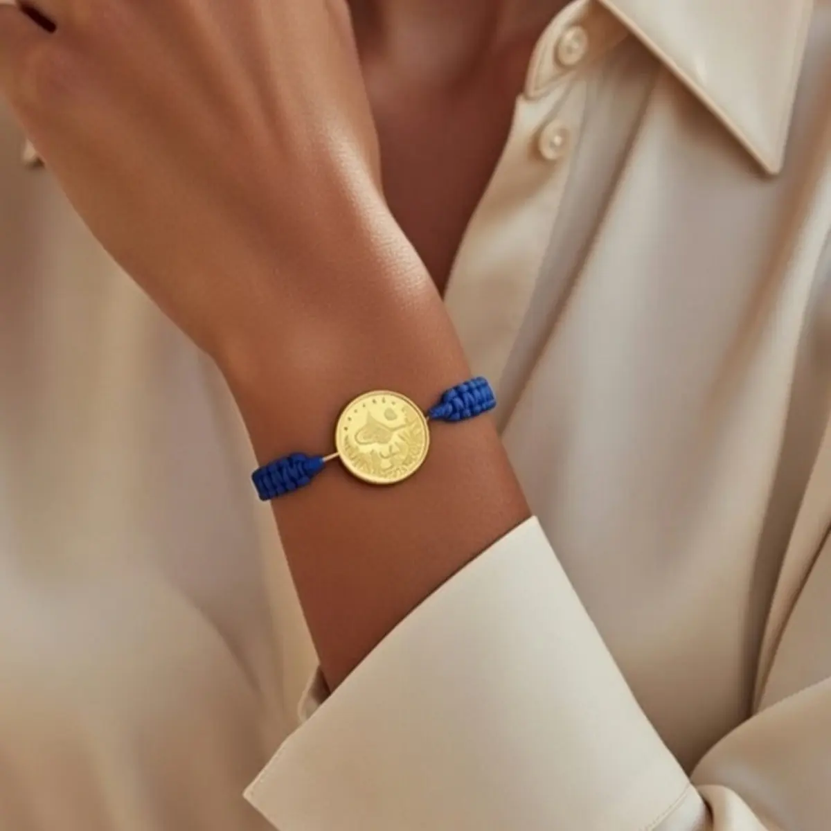 8 Ayar Altın Tuğralı İpli Bileklik (Mavi)