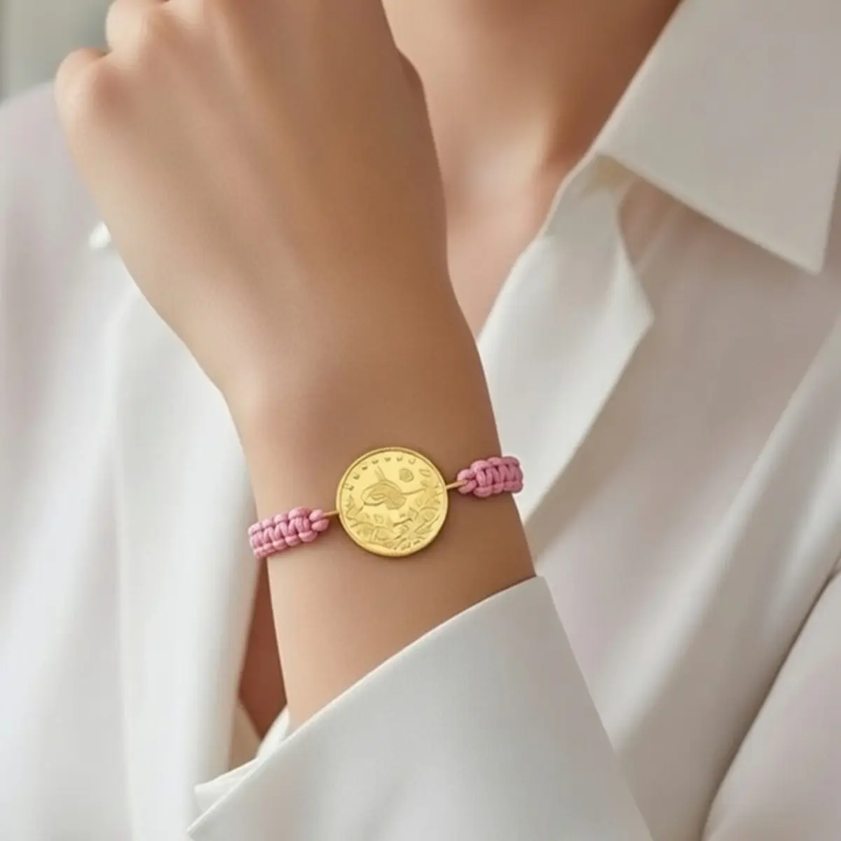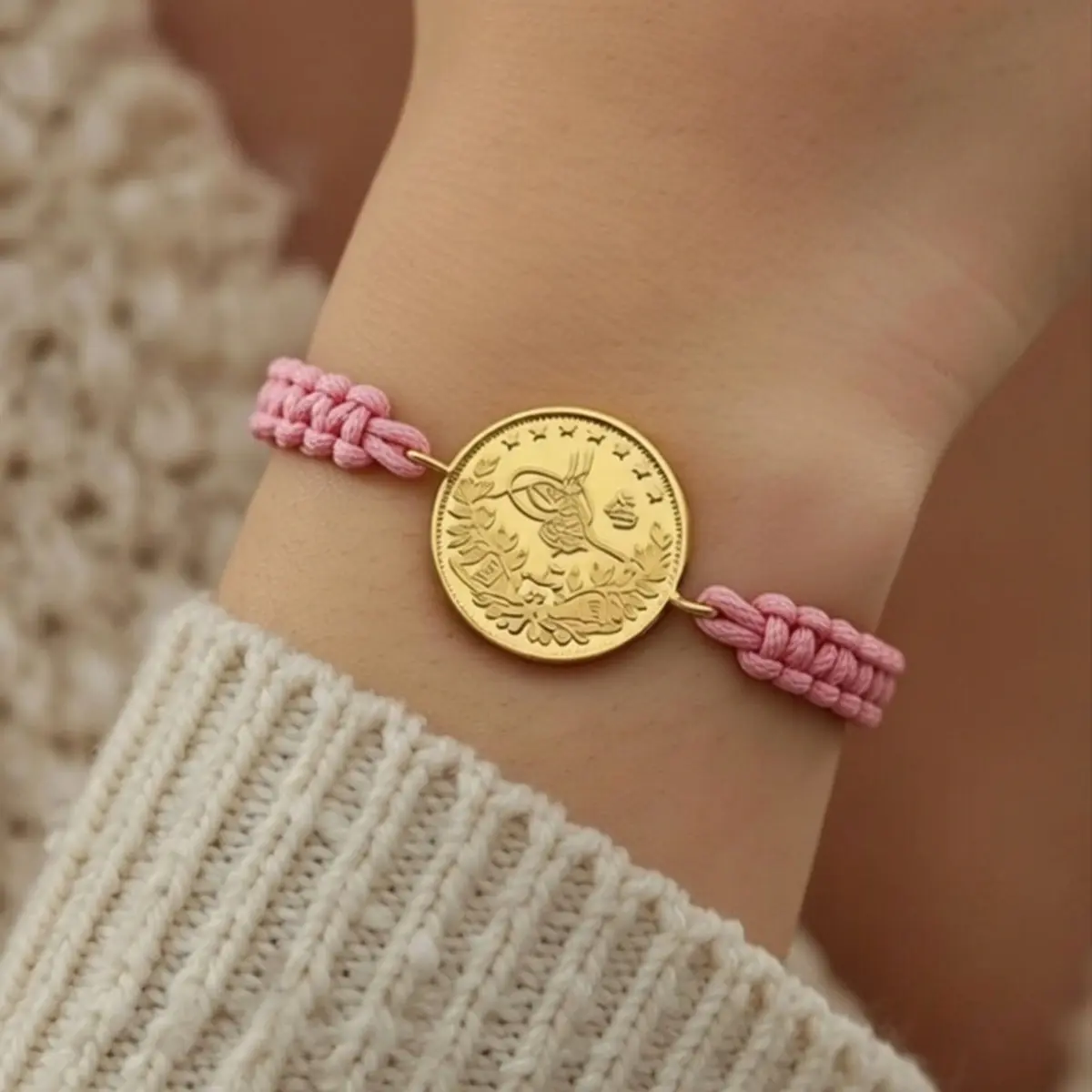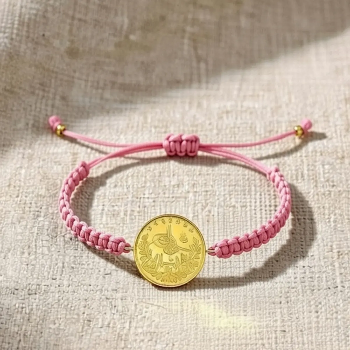 8 Ayar Altın Tuğralı İpli Bileklik (Pembe)