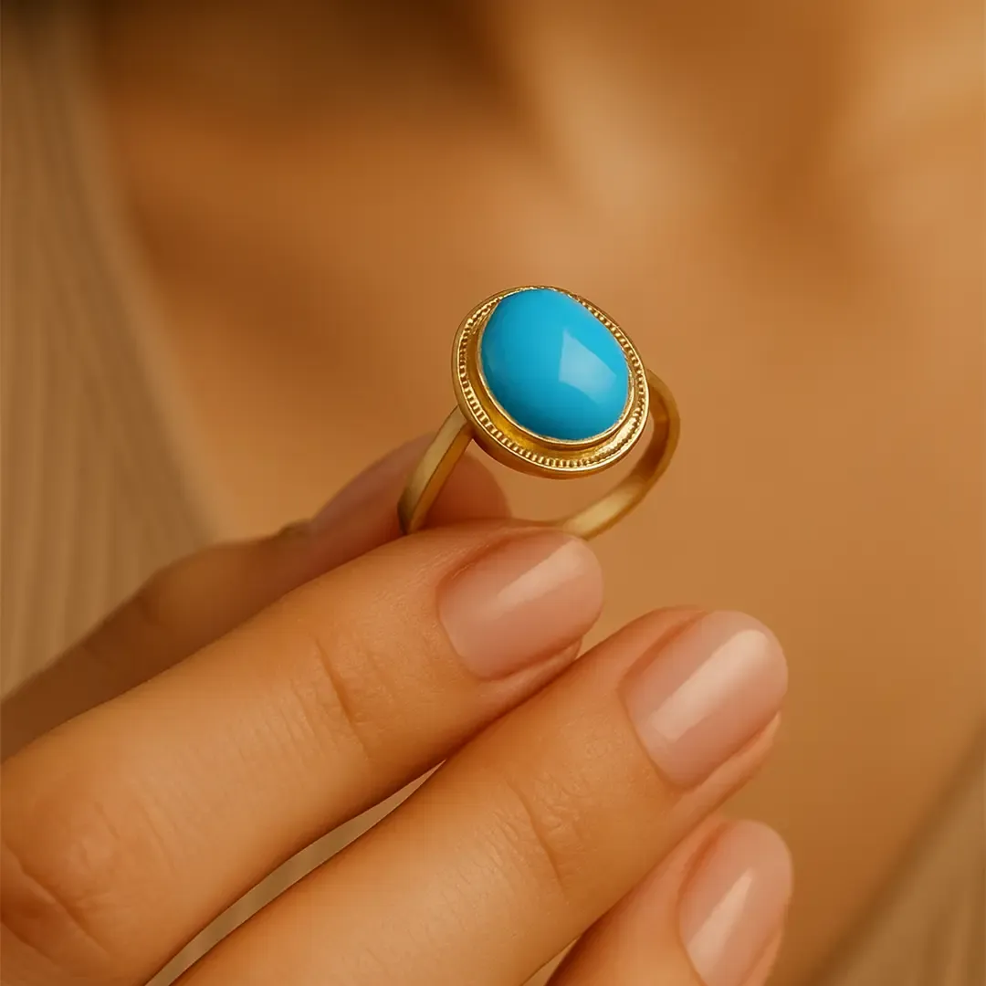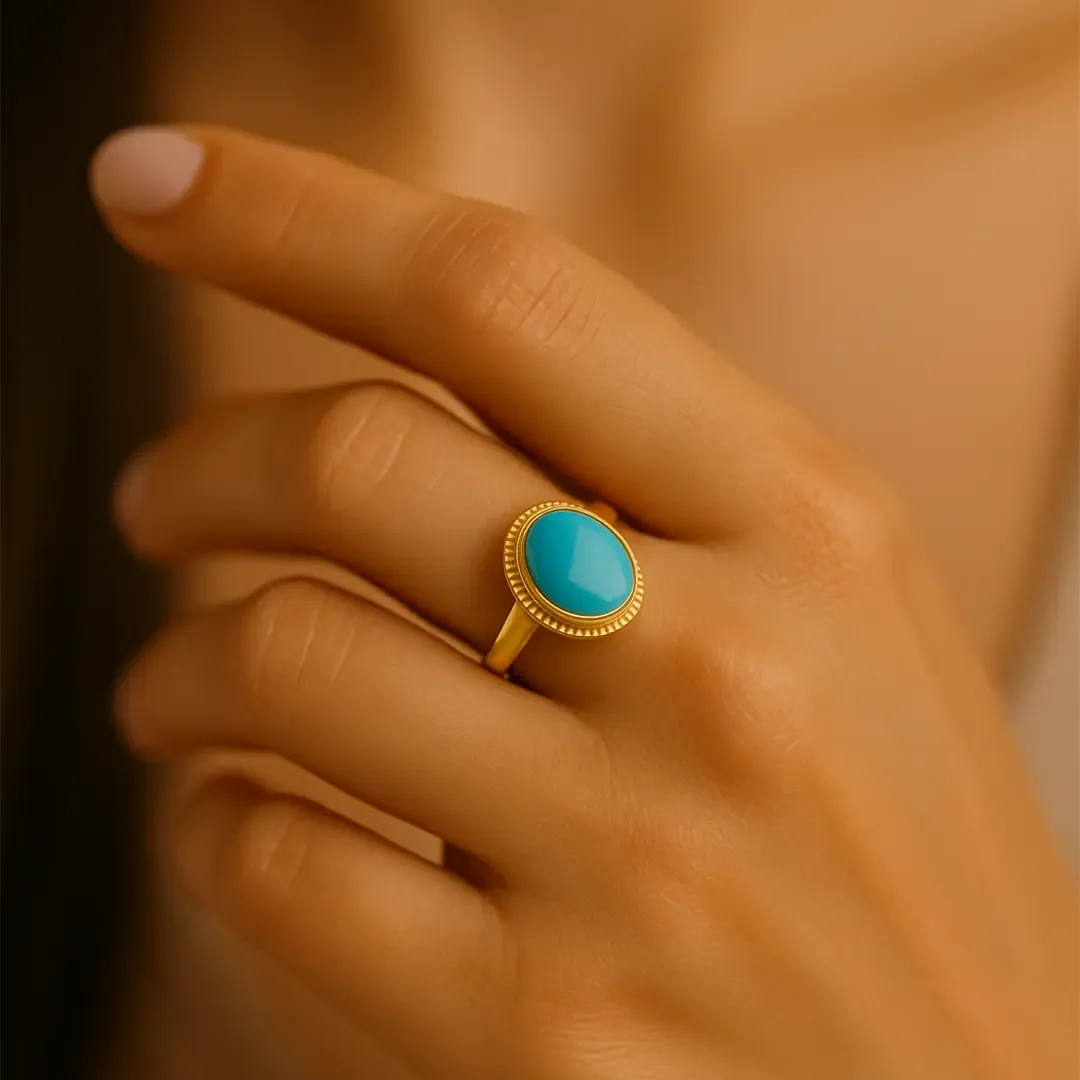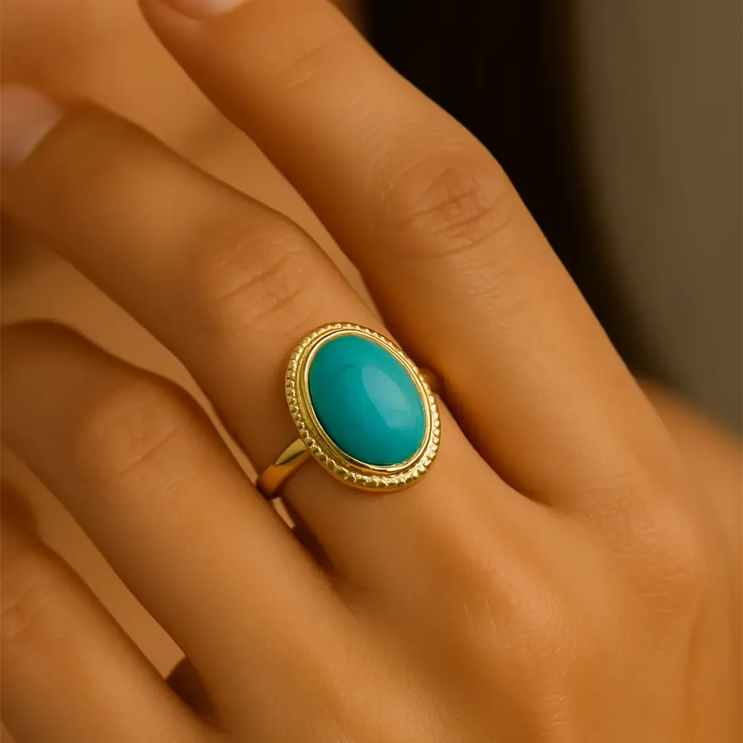 Firuze taşının huzur veren rengiyle zarif bir duruş kazandırır.