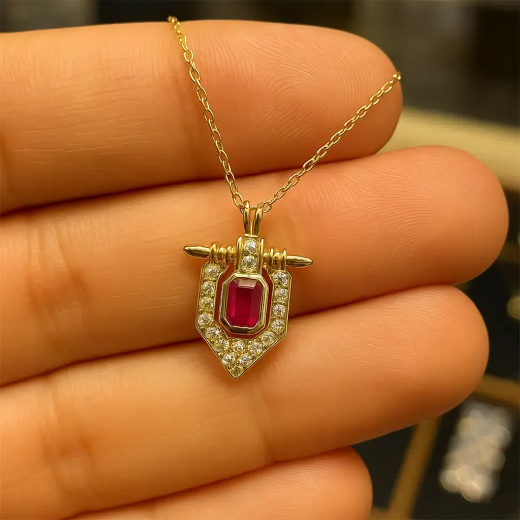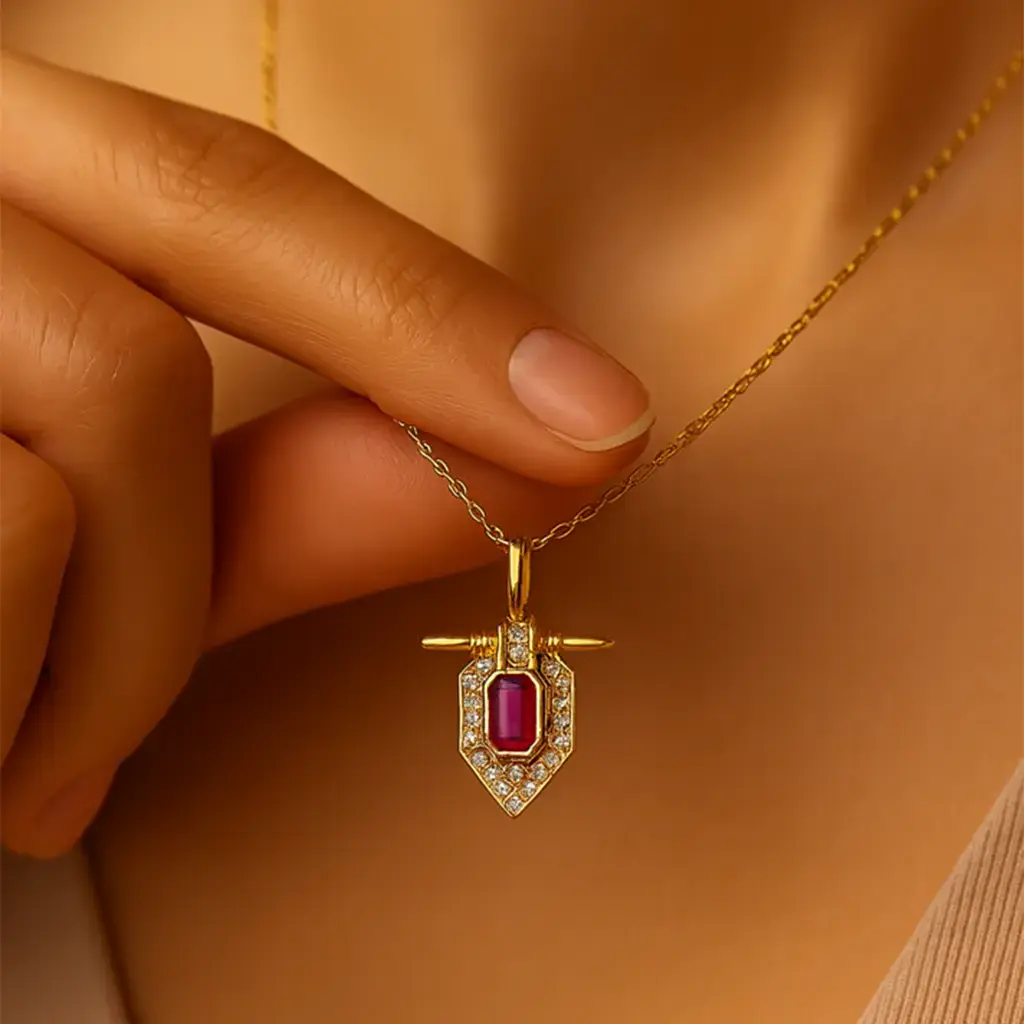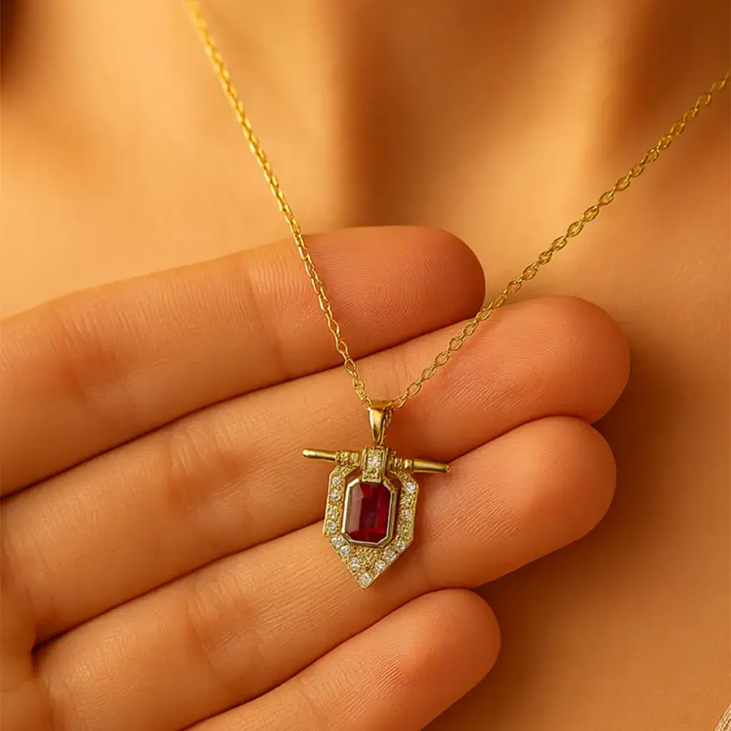 Yakut kırmızısı taşıyla asil bir ışıltı oluşturur.